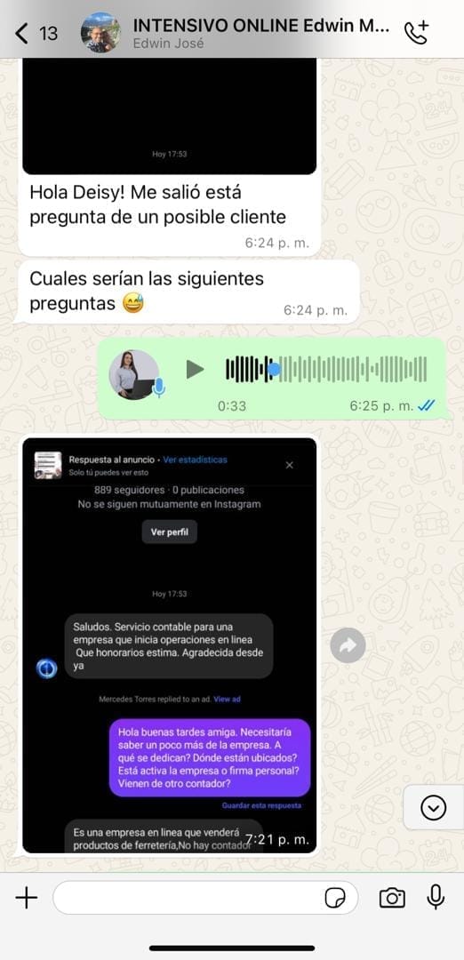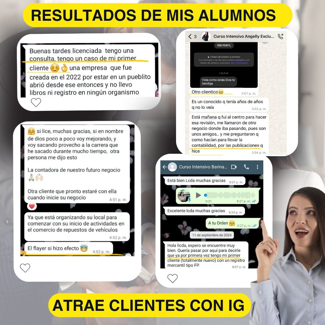 Aqui te muestro algunos pantallazos de mis colegas alumnos del intensivo Online de CONTADOR A EMPRENDOR, que aplicaron esta METODOLOGIA para ATRAER sus primeros CLIENTES.
