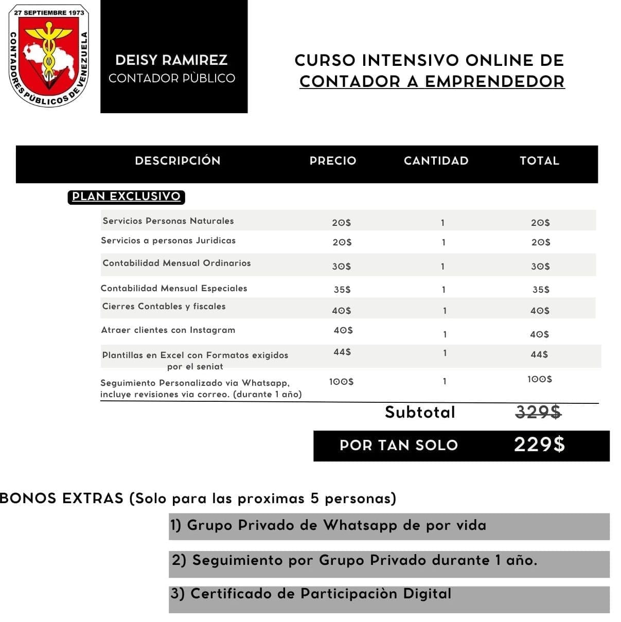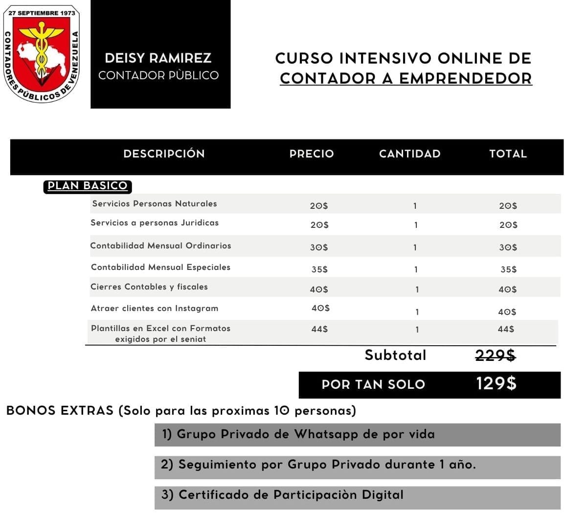 Se hicieron 2 ediciones presenciales (BARINAS-TRUJILLO) de 4 dias, 1 dia por cada modulo, sin embargo por ser un curso que abarca varios roles profesionales, (contable, fiscal, mercantil, laboral) y ademas incluye la habilidad de atraer clientes con instagram, se considero mas efiente hacerlo en modalidad online, con clases grabadas, porque al estar alojado en una plataforma online, al crear tu clave personal de acceso, puedes verlas los dias que quieras, a la hora que tu quieras durante 1 año.